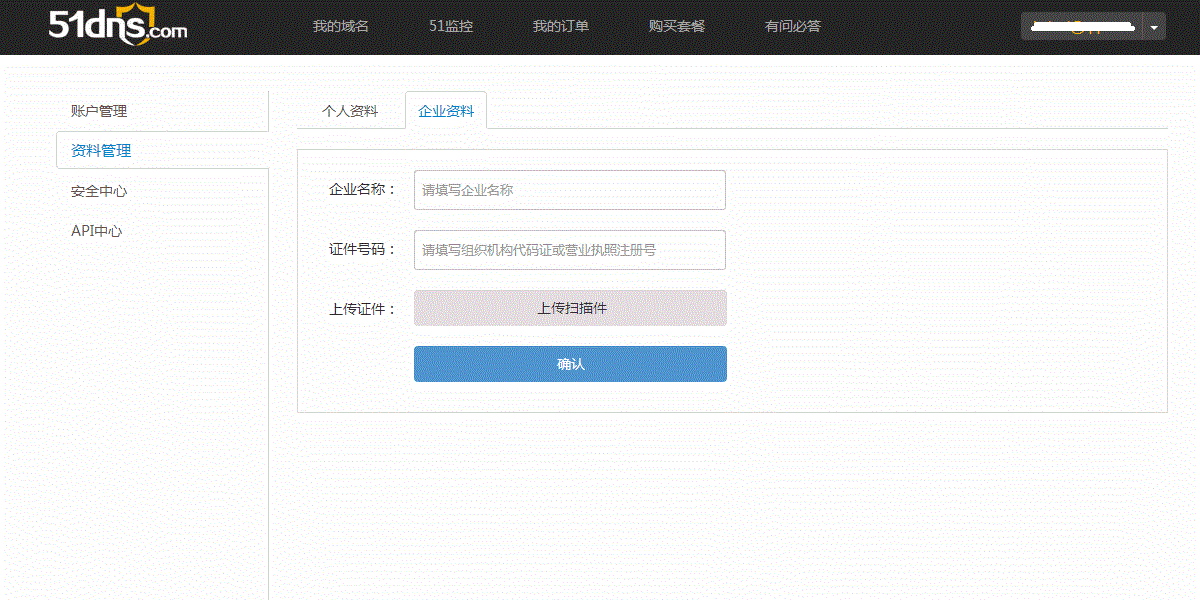 2、登陆账户,点击右上角”我的账户”——“企业资料”